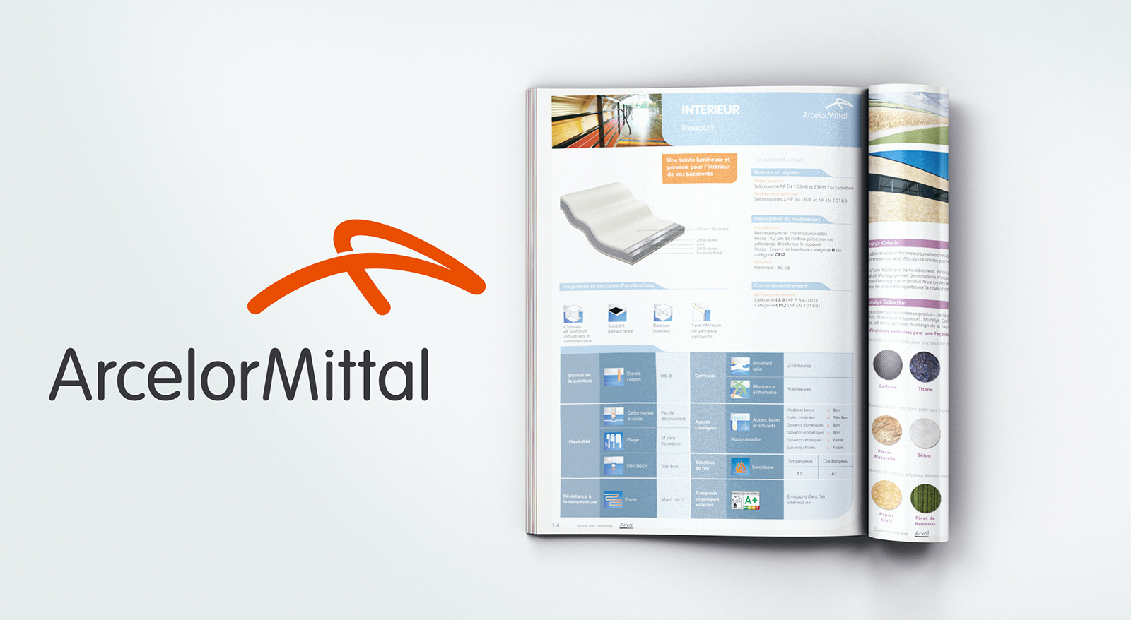 Réalisation catalogue produits. Caractéristiques des nombreux matériaux Arcelor Mittal Pour l'Agence Visae.