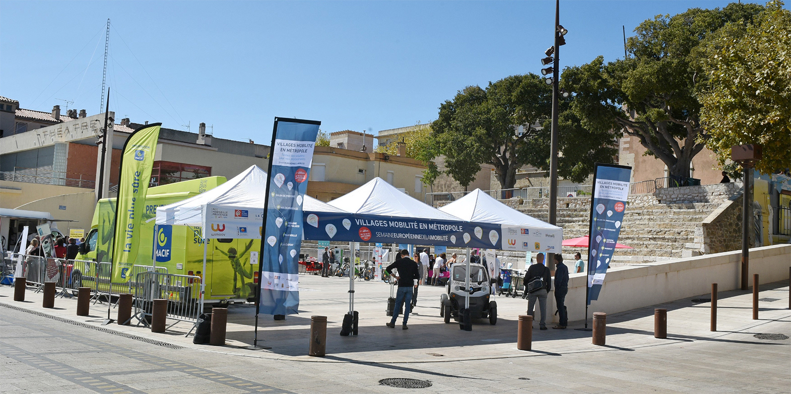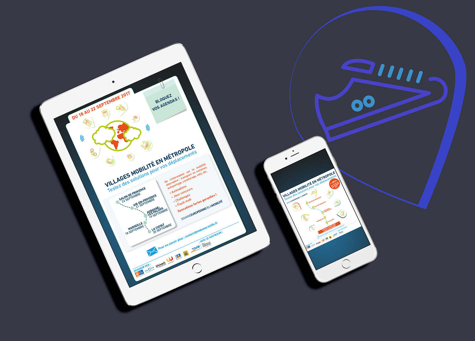 Signalétique extérieure et newsletter pour la Semaine de la Mobilité, d'après logo existant. Pour l'Agence Agora Communication.